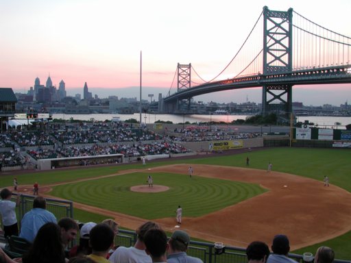 View from Camden Riverfront Stadium, showing the Philadelphia Skyline and Benjamin Franklin Bridge |