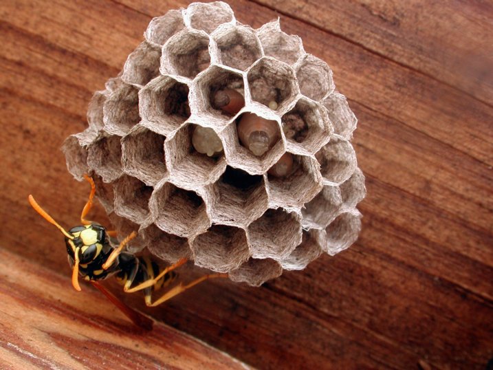 | A wasp tending her nest. You can see the eggs and larvae. |