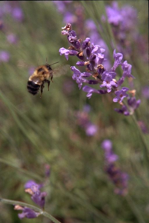 | A bee busy on a lavendar stalk. |