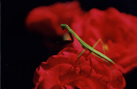 | A cool praying mantis on a rose.