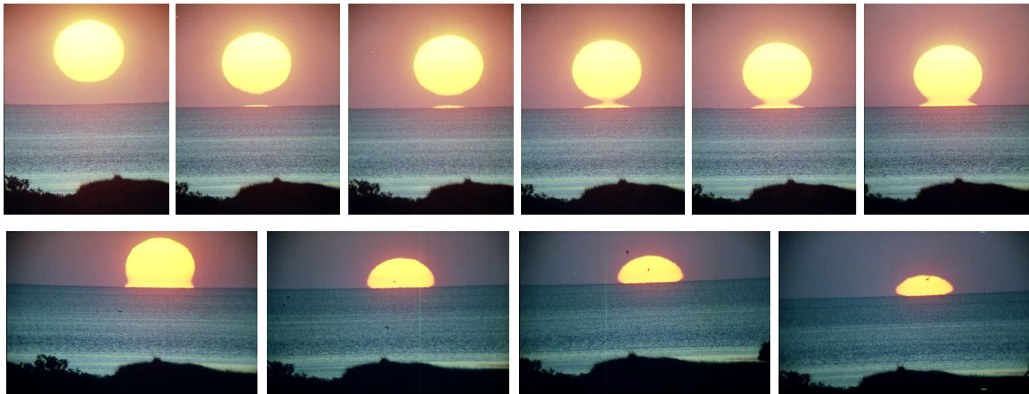 The illusion is quite awe-inspiring. As the sun nears the water horizon, it appears that the bottom drops out of the bright image and spills into the sea.